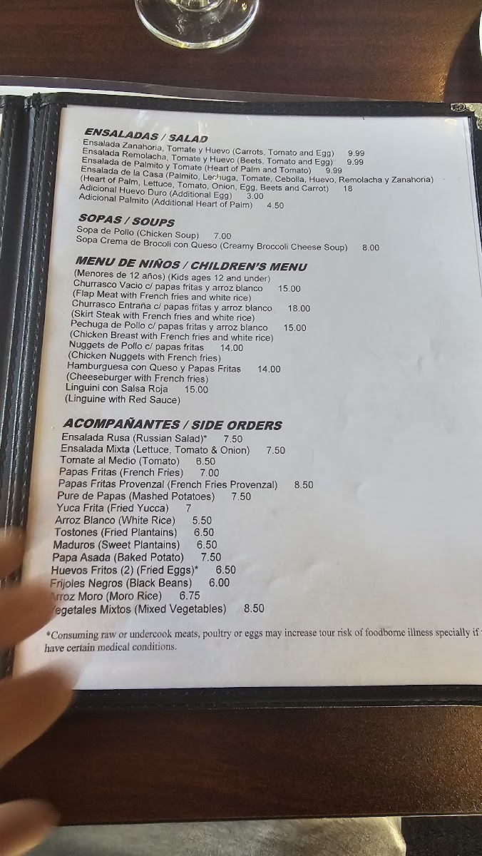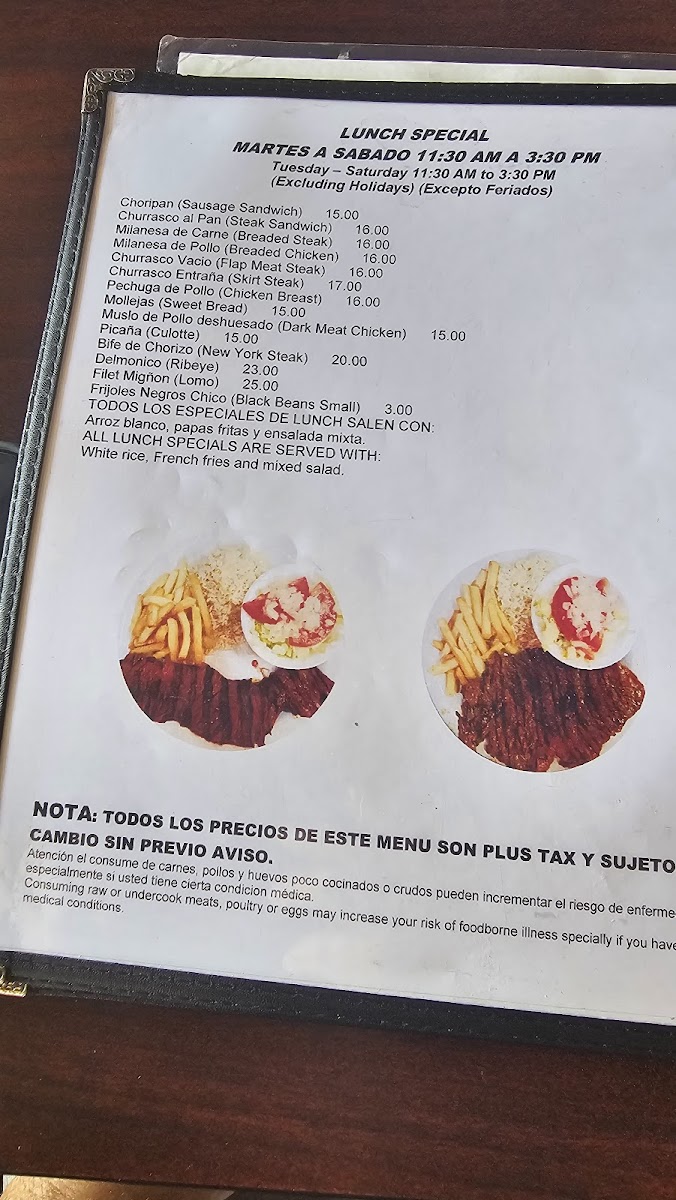 Assorted meats on grill, choice of doneness. Served with one side: white rice, mixed rice, salads, black beans, roasted or fried potatoes, mashed potatoes, fried plantains, mixed veggies.